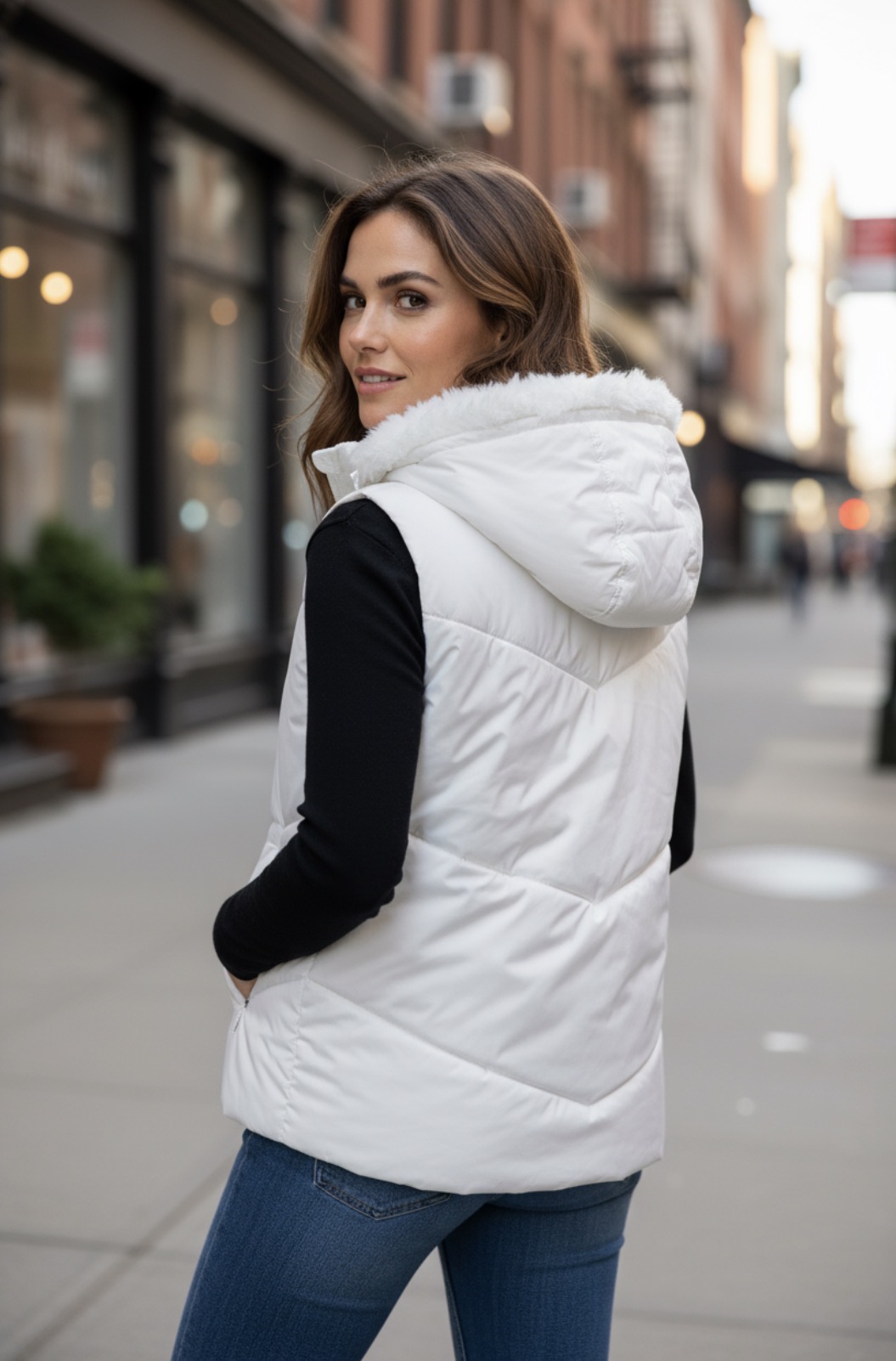 Giubbotto bianco smanicato con cappuccio, caldo e di tendenza perfetto con look sportivi oppure anche casual, da abbinare dalla tuta al jeans.